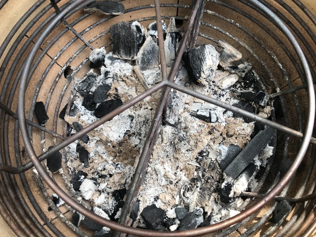 So, Kohlekorb ausgeleert und neu mit einfacher Buchenholzkohle gefüllt und mit Anzünd-